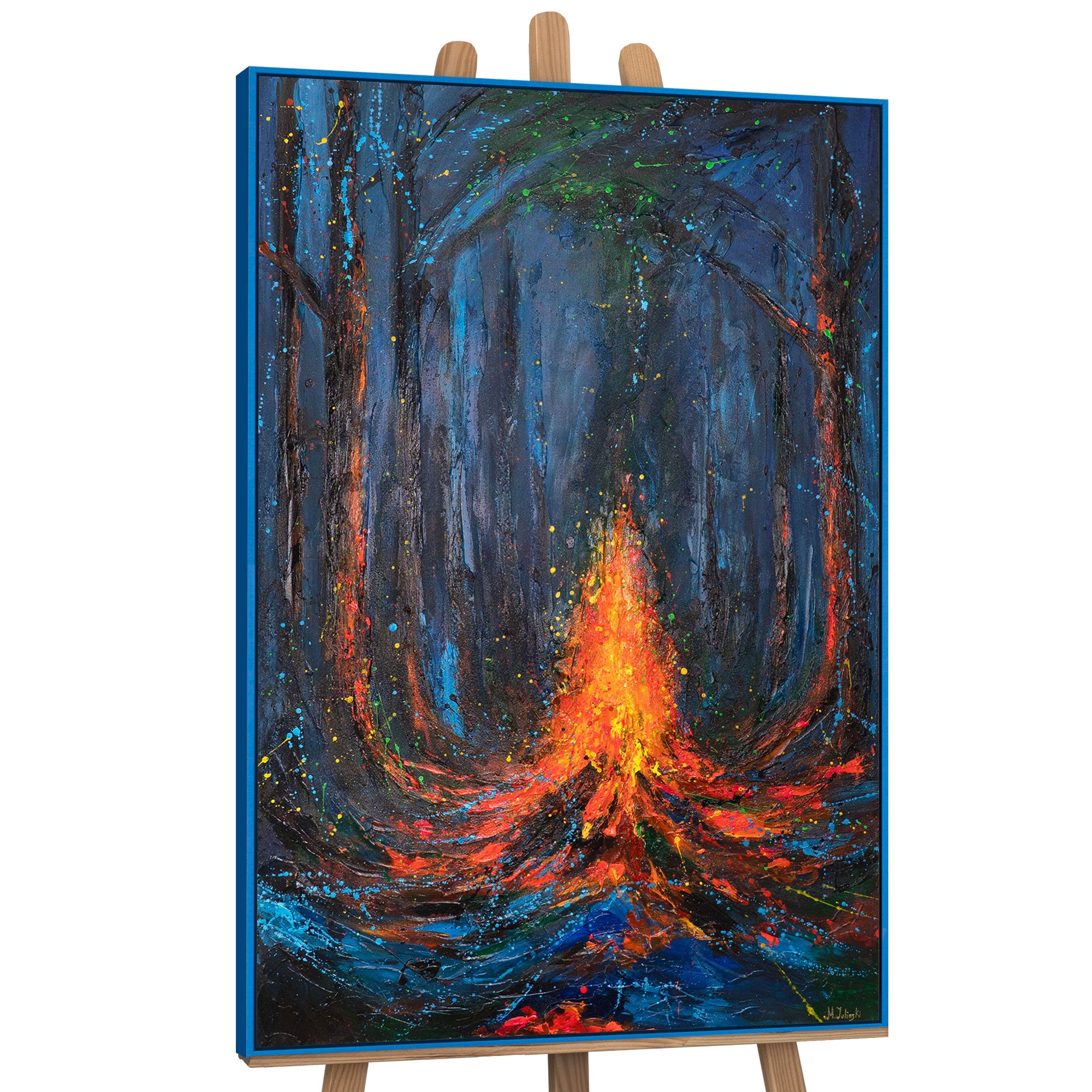 A mystically illuminated forest in deep blue and black sets the scene for a glowing, fiery flame at the center. The glowing orange and red brushstrokes dance like sparks through the darkness, creating a dramatic play of light. Fluorescent color splashes give the artwork a mysterious, almost magical atmosphere – especially striking in the dark.