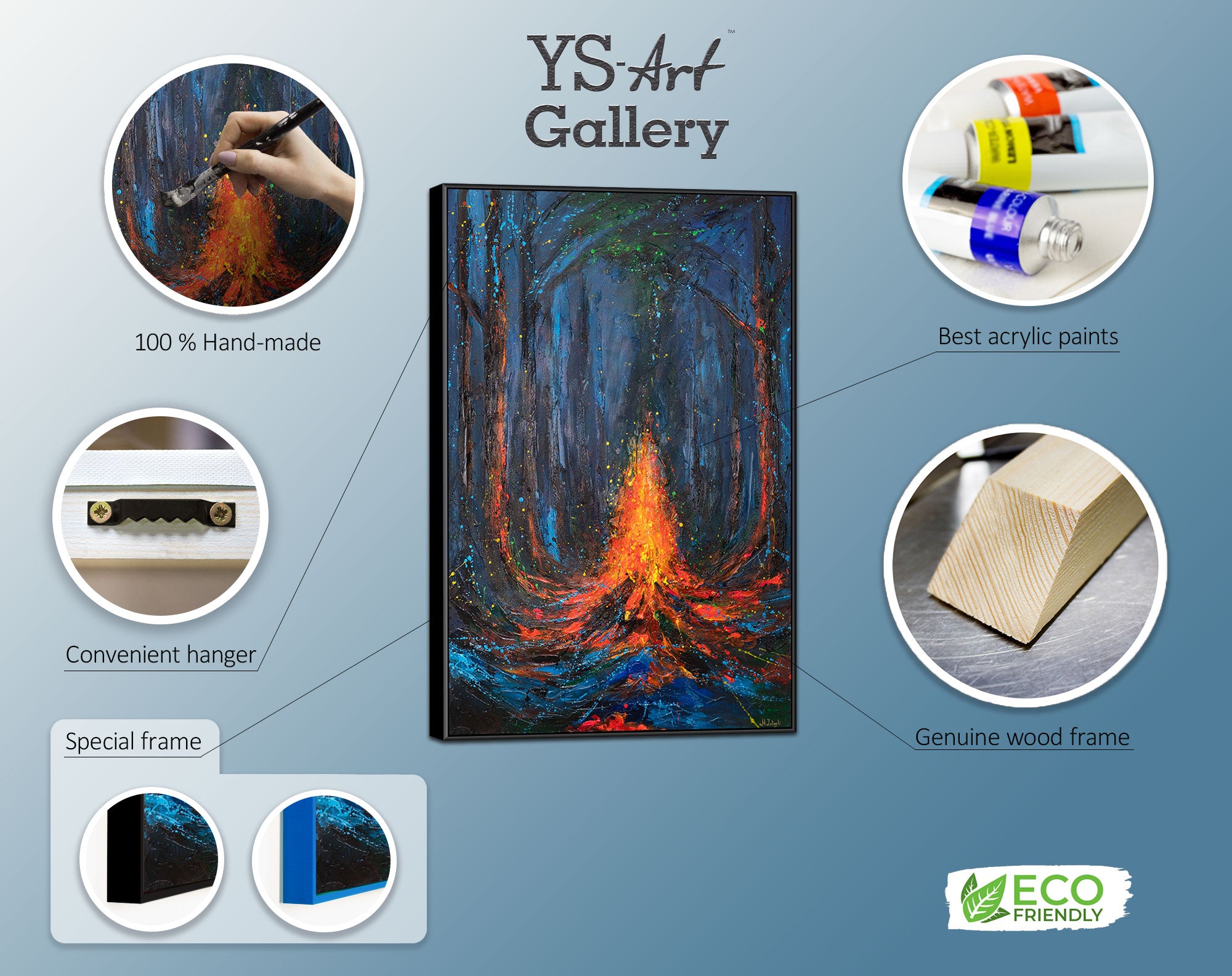 Canvas Wall Art with Frame „Fire Sparks“ – Hand-painted Night Landscape