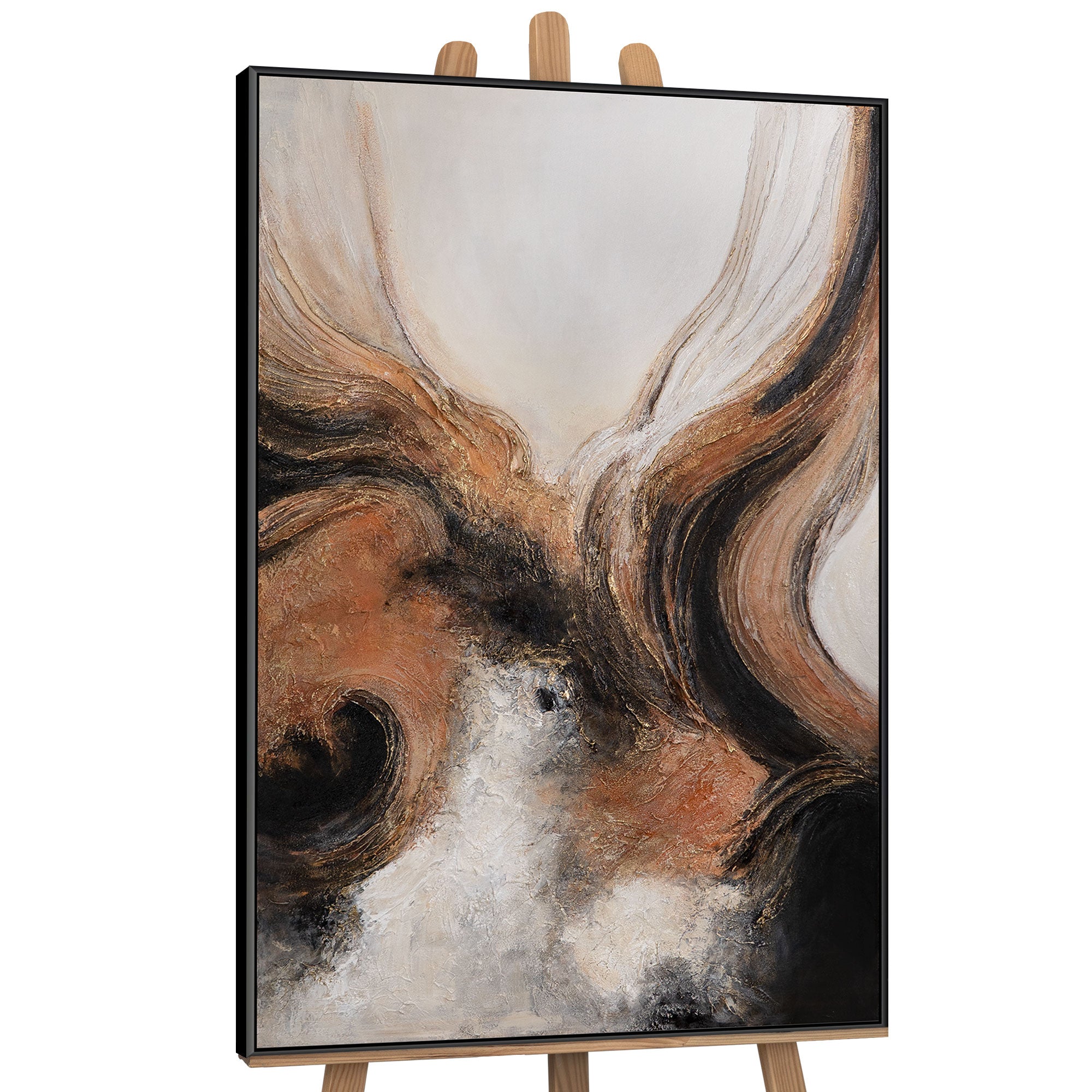 „Element in Bewegung“ ist ein handgemaltes Acrylgemälde, das mit seiner dynamischen Formensprache und den kontrastreichen Farbverläufen fasziniert. Dunkle Akzente in Schwarz verschmelzen mit warmen Braun- und Beigetönen, während die strukturierte Oberfläche Tiefe und Lebendigkeit erzeugt. Die reliefartige Gestaltung bringt Bewegung ins Bild und macht es zu einem Blickfang moderner Wandkunst.