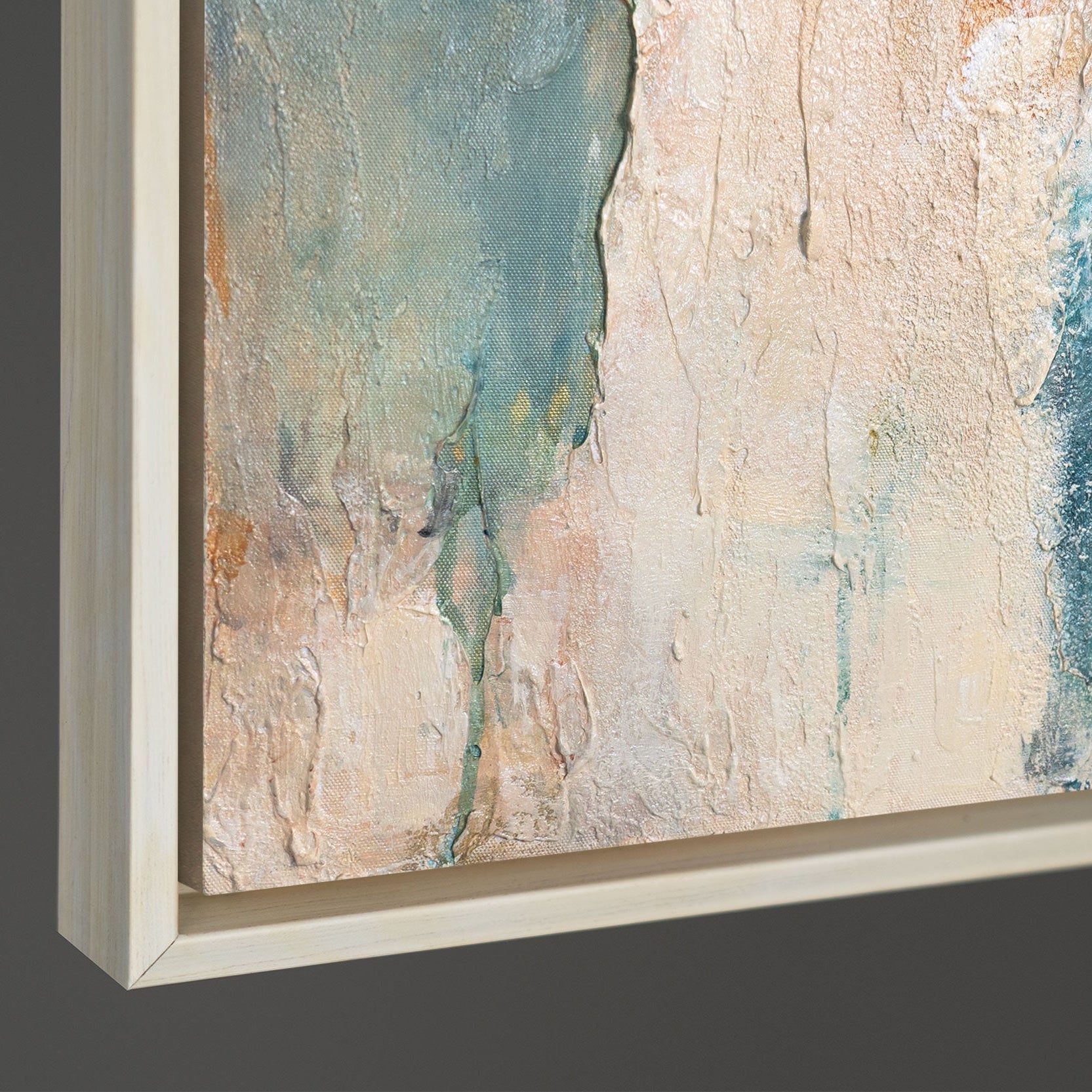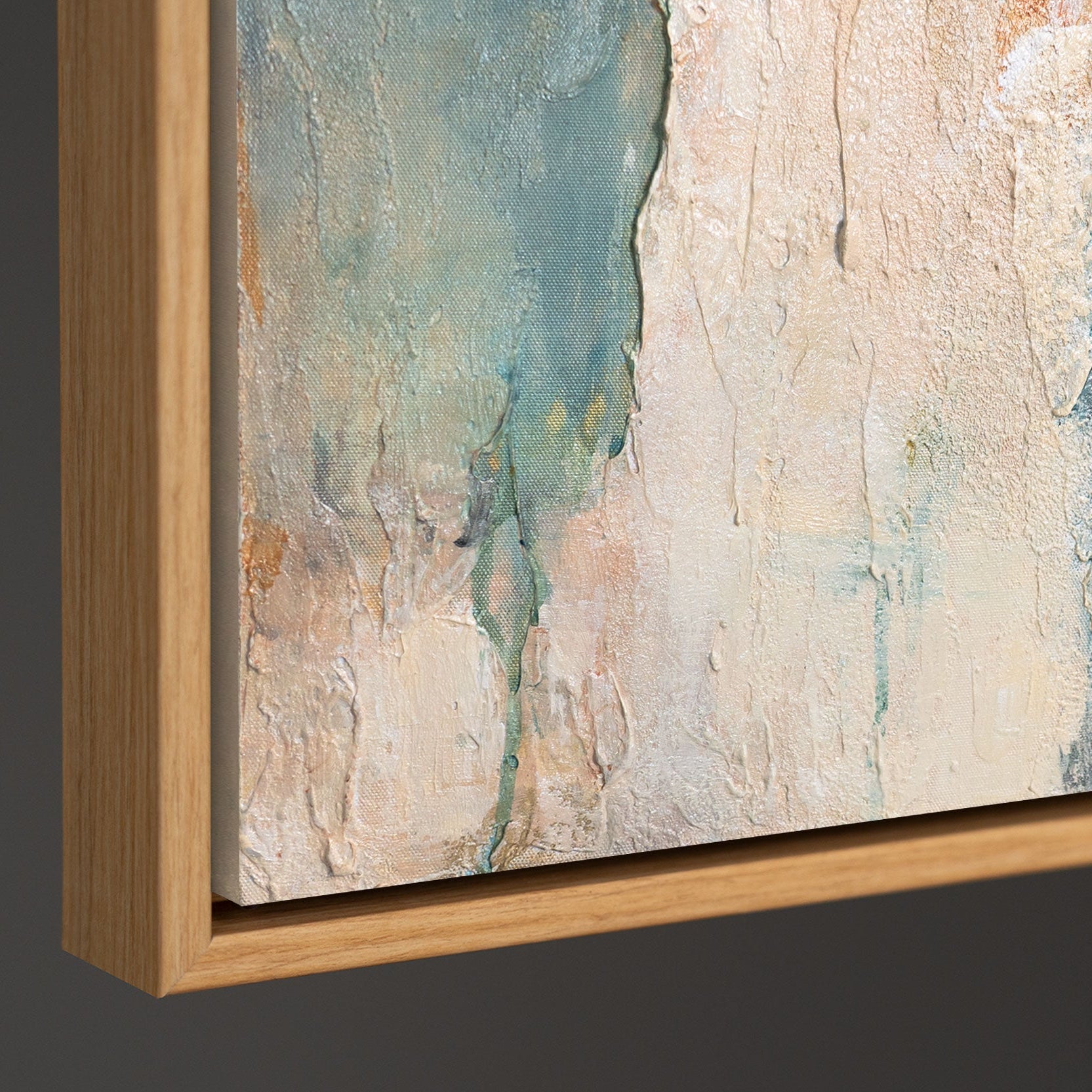 Das handgemalte Leinwandbild wird in einem Rahmen in Holzoptik präsentiert und eignet sich ideal als moderne Wanddekoration für Wohnzimmer, Schlafzimmer oder Büro. Die ausgewogene Farbkomposition fügt sich harmonisch in helle, natürliche und moderne Wohnkonzepte ein.