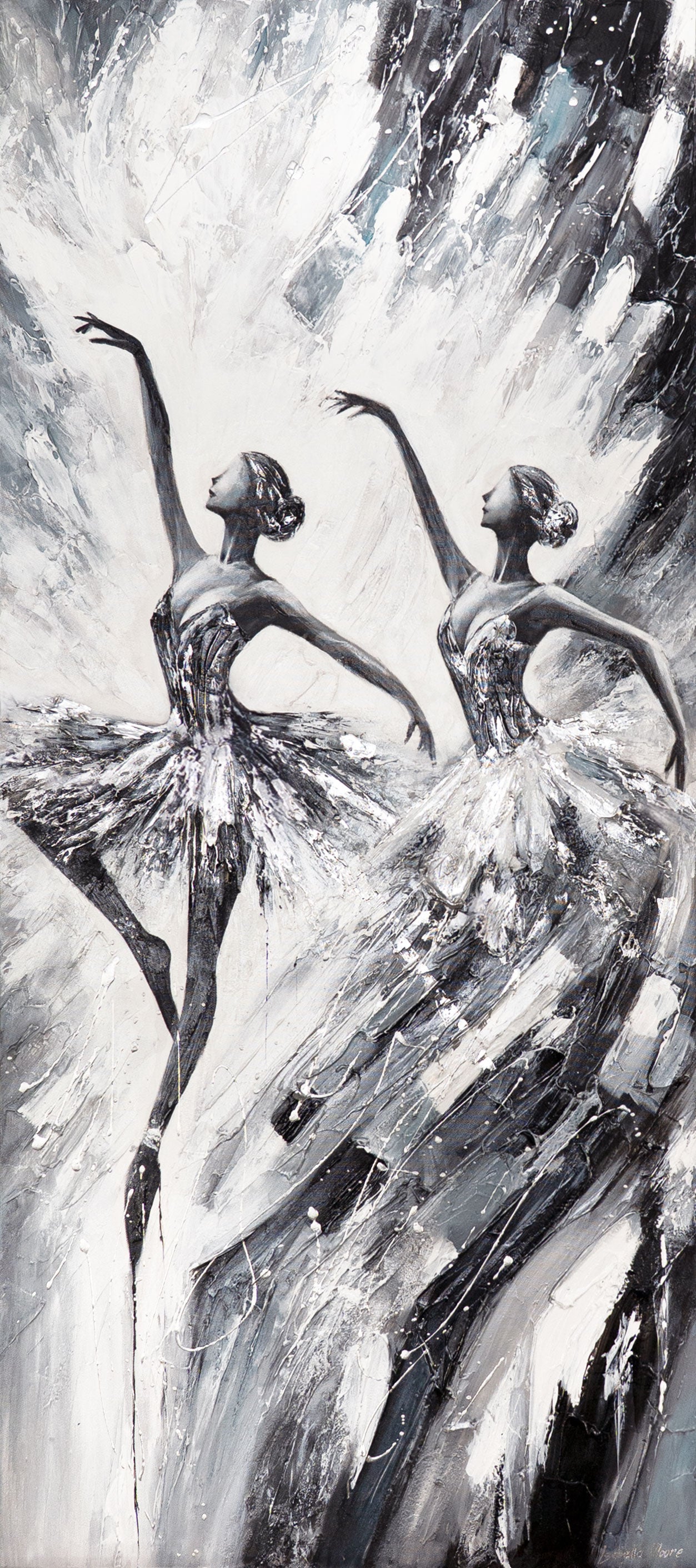 „Die Kraft der Anmut“ ist ein handgemaltes Acrylbild auf Leinwand, das in expressiven Pinselstrichen zwei Ballerina‑Figuren in dynamischer Leichtigkeit darstellt. Die reduzierte Farbpalette aus Schwarz, Weiß und Grau lässt das Motiv zeitlos wirken und betont die Bewegung.