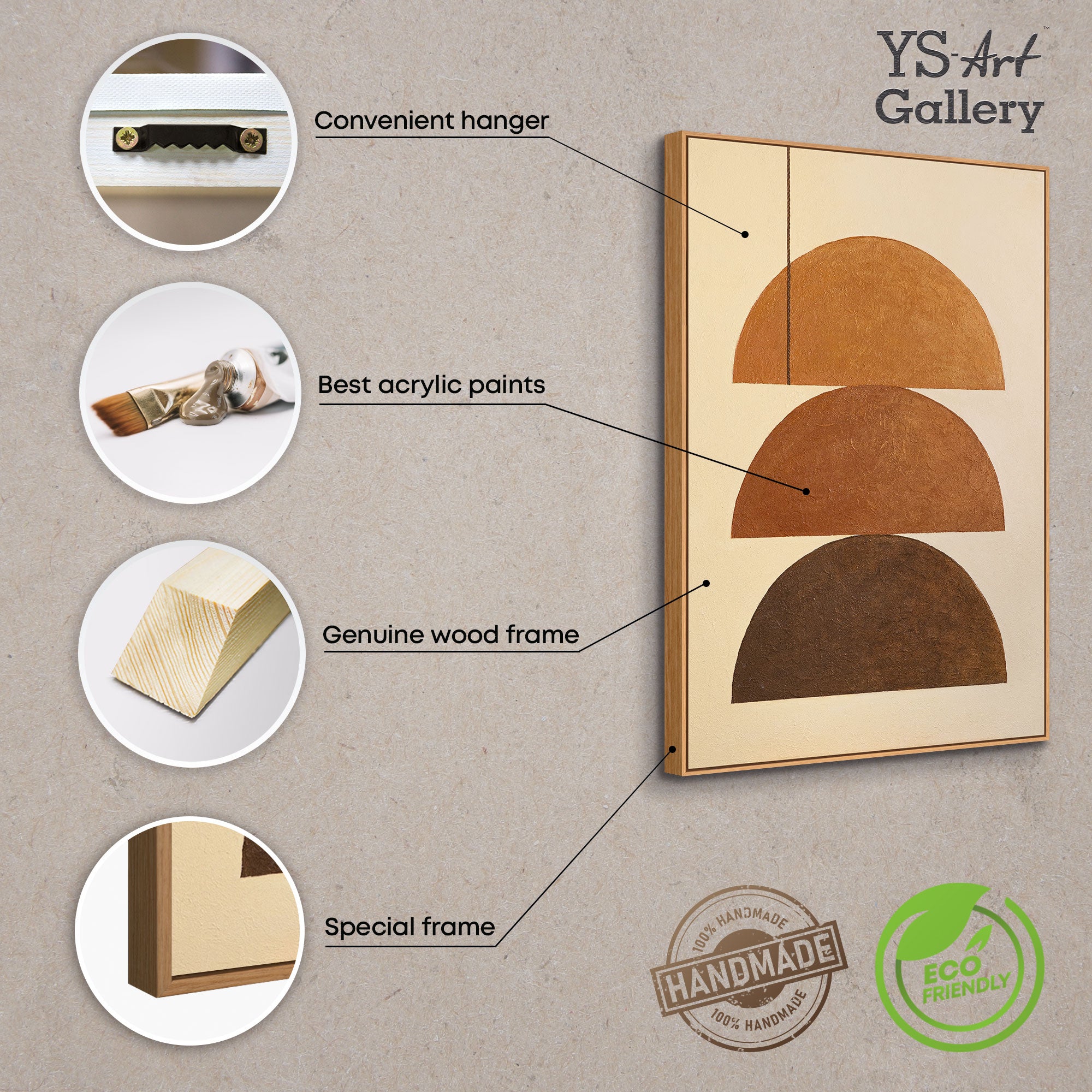 „Drei Horizonte“ ist ein modernes, handgemaltes Acrylgemälde, das durch seine klaren geometrischen Formen und harmonischen Farbabstufungen besticht. Drei Halbkreise in warmen Erd- und Brauntönen sind übereinander angeordnet und erzeugen eine minimalistische, aber zugleich kraftvolle Komposition. Die strukturierte Oberfläche unterstreicht die Tiefe des Werkes und verleiht den Farben eine besondere Lebendigkeit.