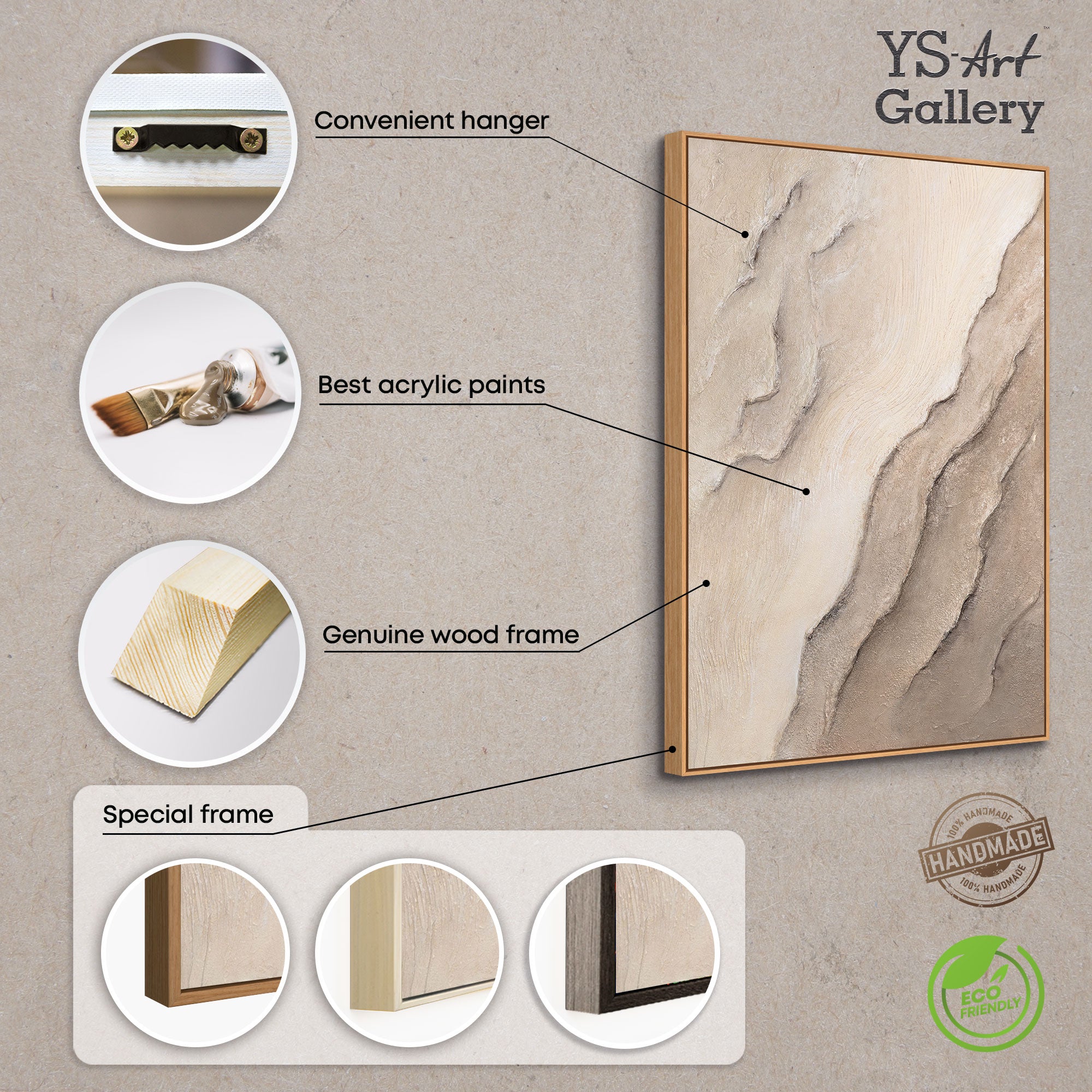 „Spuren der Zeit“ ist ein handgemaltes Acrylgemälde, das durch seine weichen Linien und harmonischen Strukturen besticht. Die Farbpalette aus Beige-, Sand- und Naturtönen vermittelt Ruhe und Zeitlosigkeit, während die reliefartige Oberfläche Tiefe und Natürlichkeit hervorhebt. Jede feine Linie erinnert an geologische Schichten und schafft eine organische, fast meditative Wirkung.