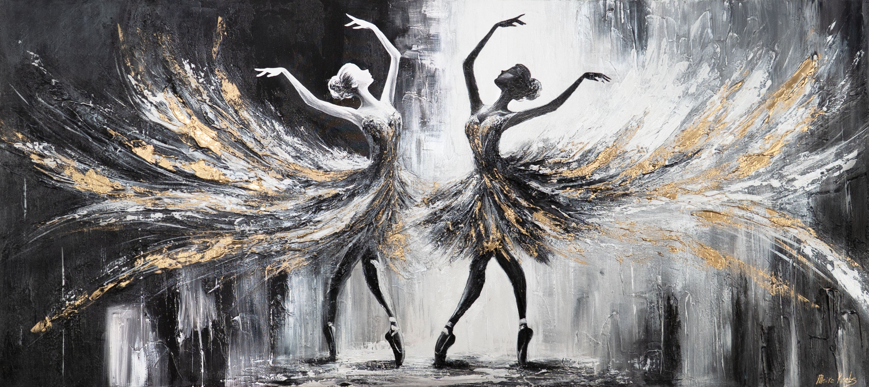 „Die Brillanz des Balletts“ ist ein handgemaltes Acrylbild, das zwei tanzende Diven in dynamischer Bewegung zeigt. Schwungvolle Pinselstriche in Schwarz, Weiß, Grau und Gold erzeugen eine abstrakte Komposition, die Anmut und Energie vereint.