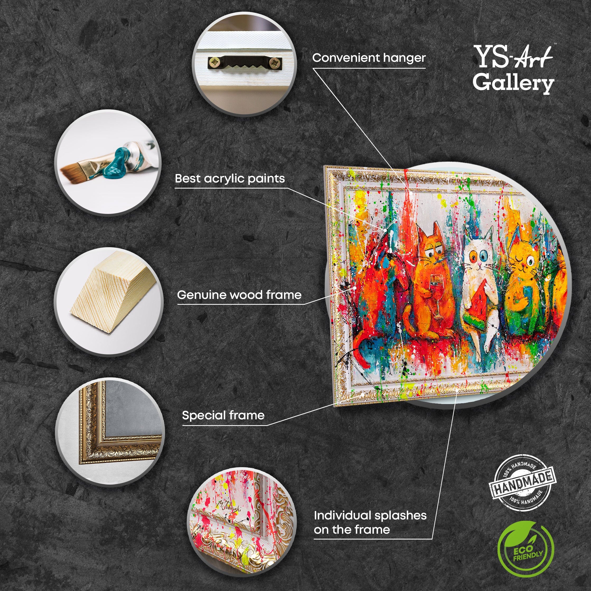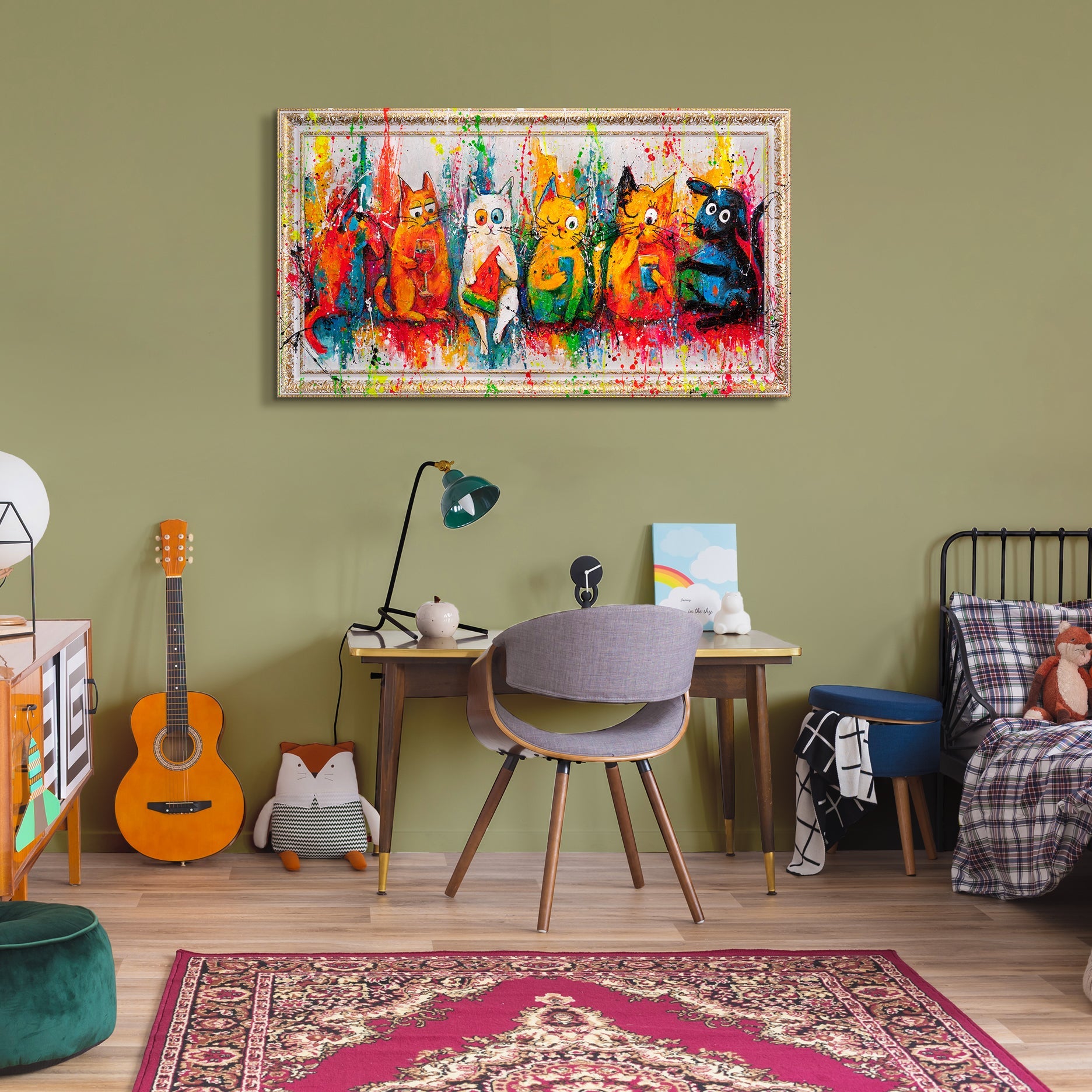 Perfekt für alle, die katzenbilder wandbilder, bunte wanddeko wohnzimmer oder moderne kunst auf leinwand suchen. Dieses Werk ist 100 % handgemalt, mit edlem Rahmen und einzigartigem Charme – ein echtes Statement-Piece.