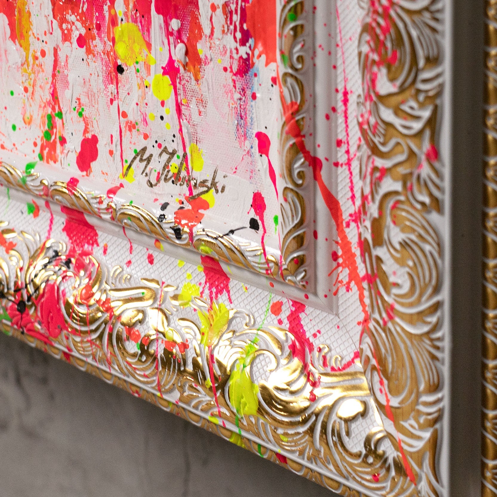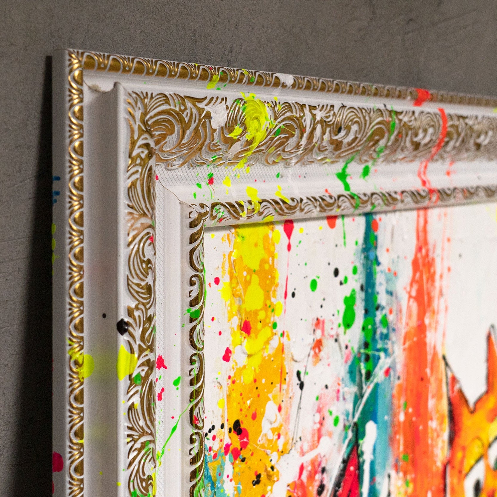 „Katzen, Farbe, Spaß“ ist ein farbenfrohes Pop-Art Kunstwerk voller Humor, Energie und Lebensfreude. Sechs Katzen – jede mit eigenem Charakter – genießen Wein, Snacks und Gesellschaft. Die bunten Farbspritzer in Orange, Blau, Rot und Grün machen dieses Bild zu einem lebendigen Blickfang, der jedes Wohnzimmer in eine Galerie verwandelt.