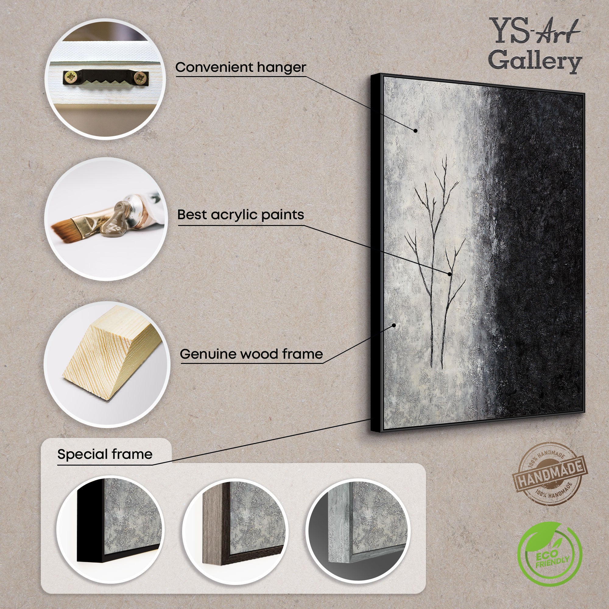 • Handgemalte Acrylmalerei mit Rahmen „Atem des Winters“ – Abstrakte Kunst in Schwarz-Weiß