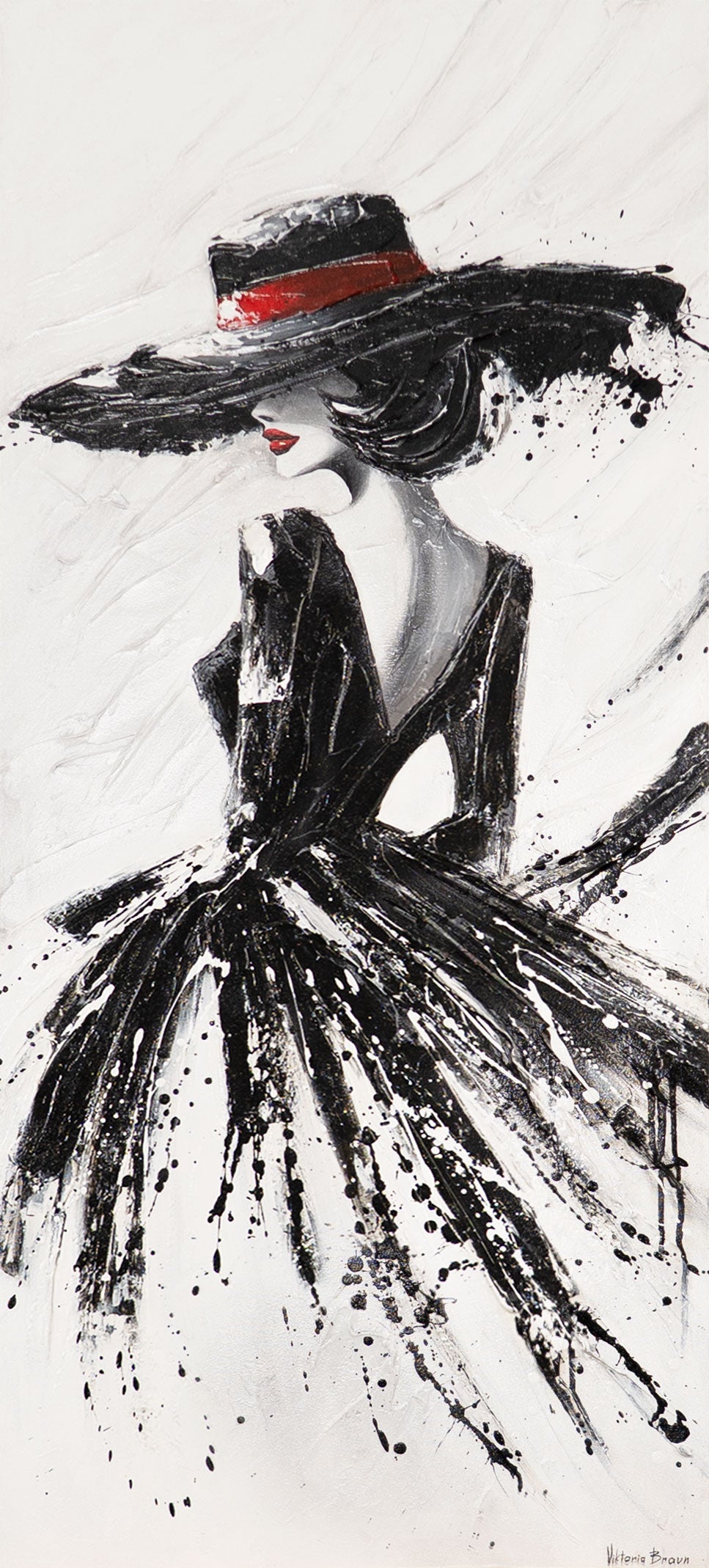 „Die Dame“ ist ein handgemaltes Acrylbild, das eine stilisierte Frau in einem eleganten schwarzen Kleid mit weit schwingendem Rock und markantem Hut zeigt. Der rote Akzent auf dem Hut setzt ein klares, feminines Statement und verleiht dem monochromen Werk einen Hauch von Dramatik. Die strukturierte Malweise unterstreicht die Dynamik und bringt Bewegung auf die Leinwand.