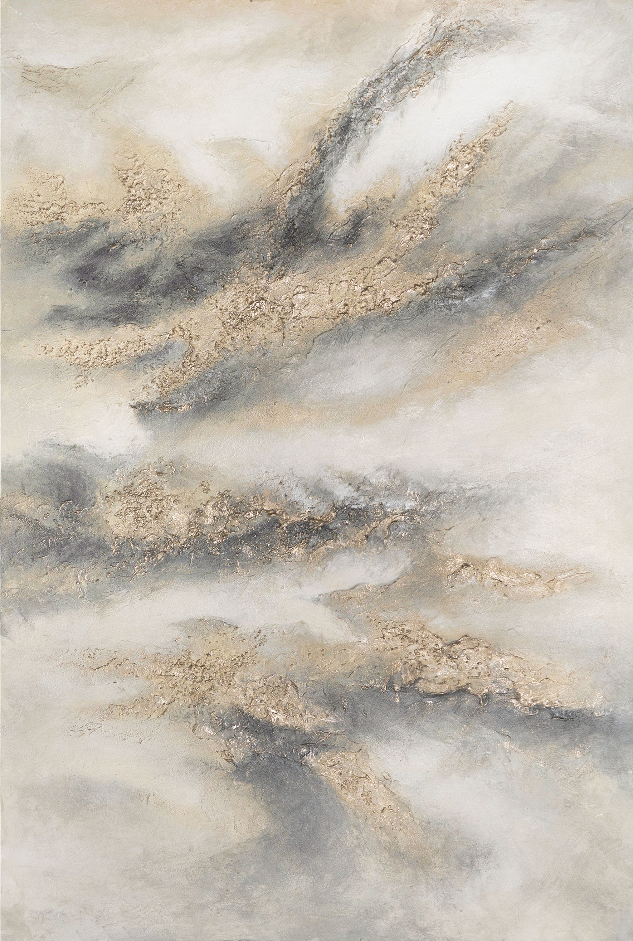 Bringen Sie Ruhe und Eleganz in Ihr Zuhause mit diesem handgemalten Struktur-Gemälde. Sanfte Wolkenformen in Grau, Beige und Weiß verschmelzen harmonisch mit goldenen Akzenten und verleihen dem Bild eine edle, fast schwebende Leichtigkeit. Jeder Pinselstrich und jede Reliefstruktur macht dieses Werk zu einem einzigartigen Kunstobjekt.