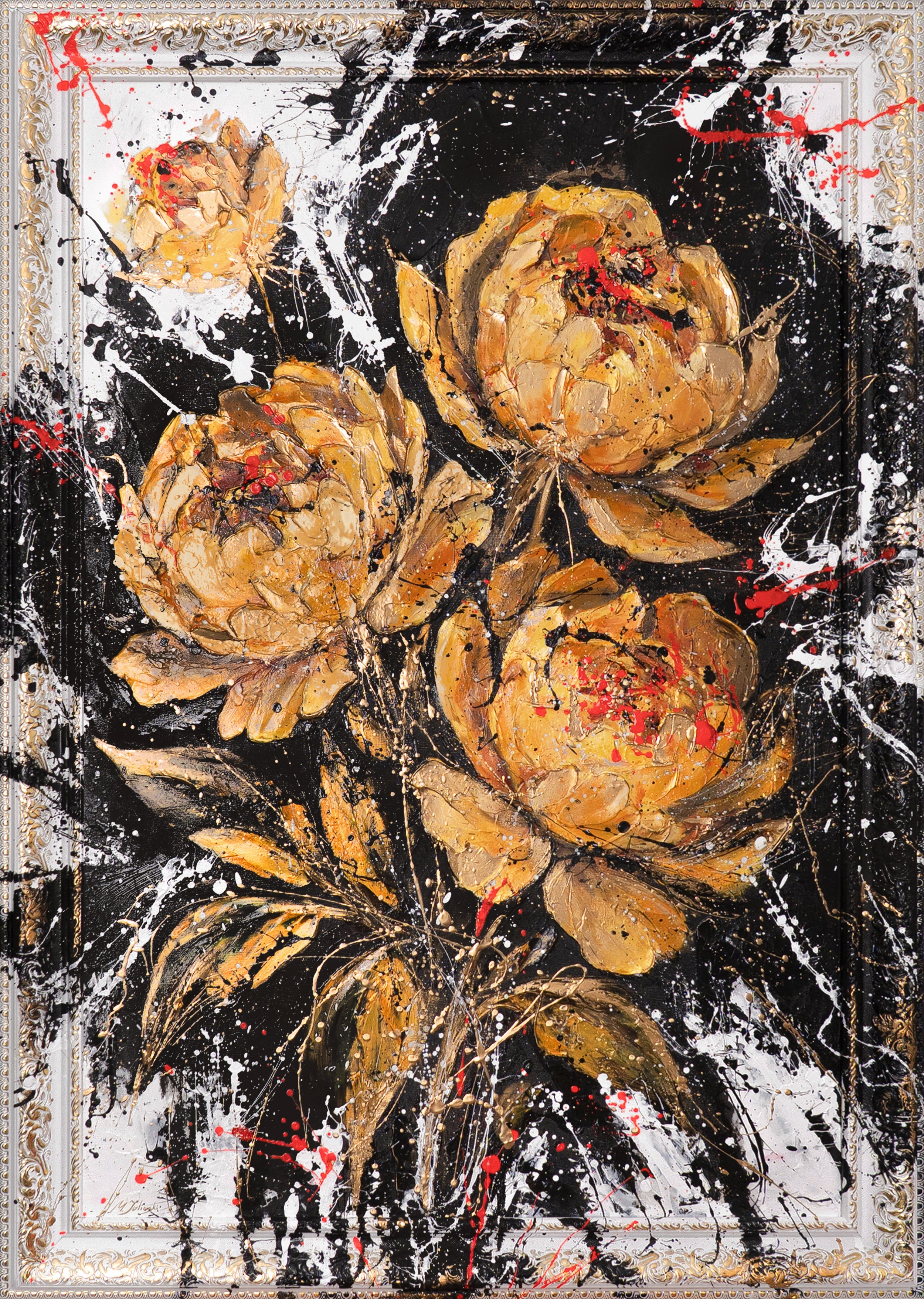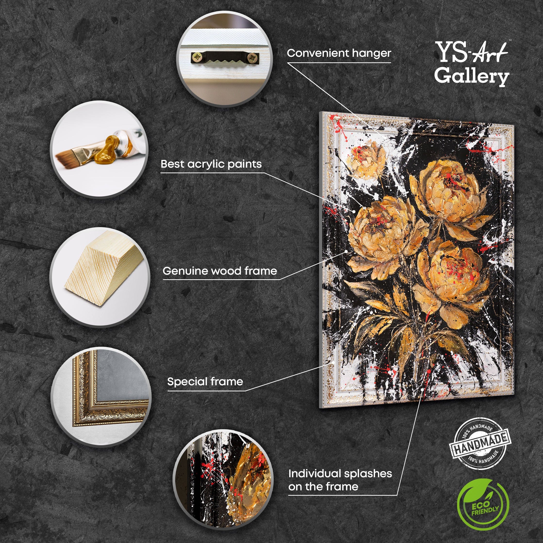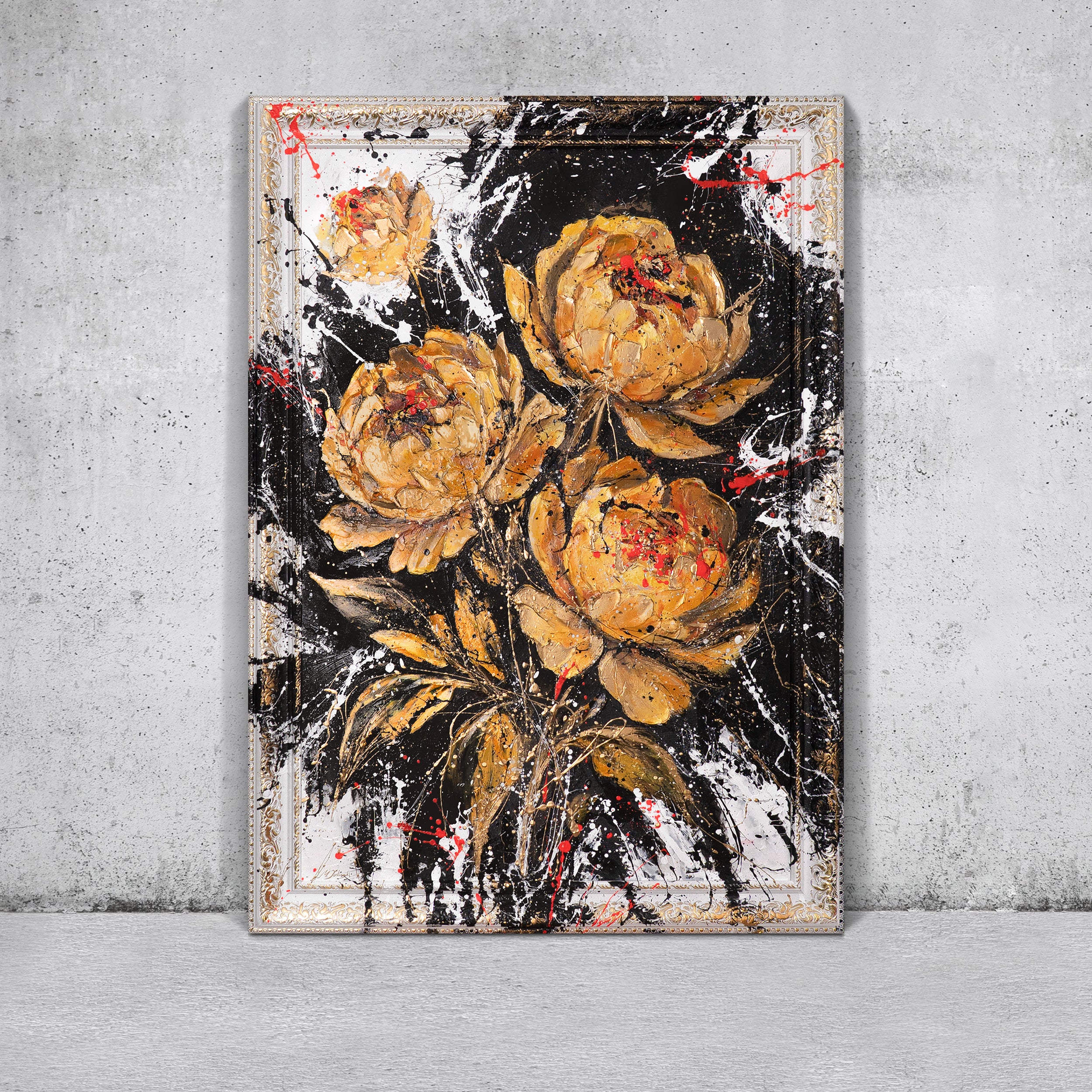 Handgemaltes Acrylbild mit Goldblumen – Wand Kunst Dekor "Samtiger Glanz"