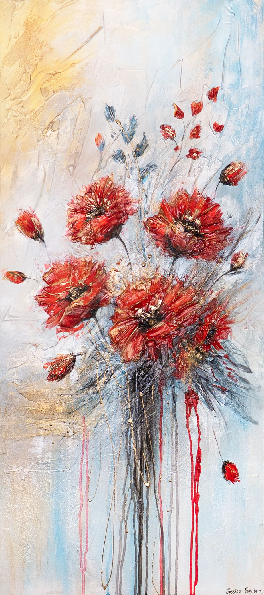 Das Acrylgemälde „Rote Mohnblumen“ besticht durch seine leuchtende Farbigkeit und strukturreiche Maltechnik. Die roten Mohnblüten stehen kontrastreich vor einem hellen Hintergrund in sanftem Beige, Grau und Blau. Goldene Akzente unterstreichen die Ausdruckskraft und verleihen dem Werk eine elegante Wärme.