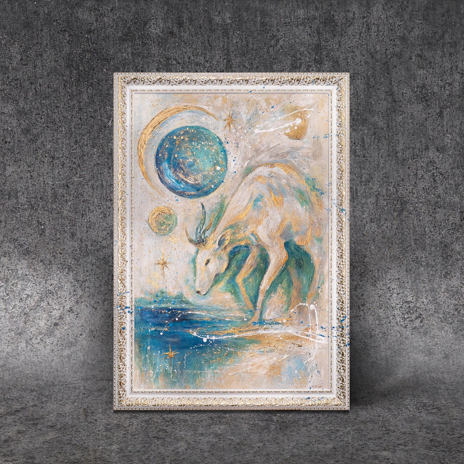 Verleihen Sie den Wänden eine magische und würdevolle Ausstrahlung. Das handgemalte Kunstwerk "Mondwächter" inszeniert den majestätischen Hirsch als Symbol für Stärke und Verbundenheit mit der Natur in einer modernen, abstrakten Umgebung. Diese moderne Kunst Wandbilder faszinieren durch ihre mystische Atmosphäre und schaffen eine kraftvolle visuelle Präsenz, die Ruhe und Erhabenheit in jeden Raum bringt.