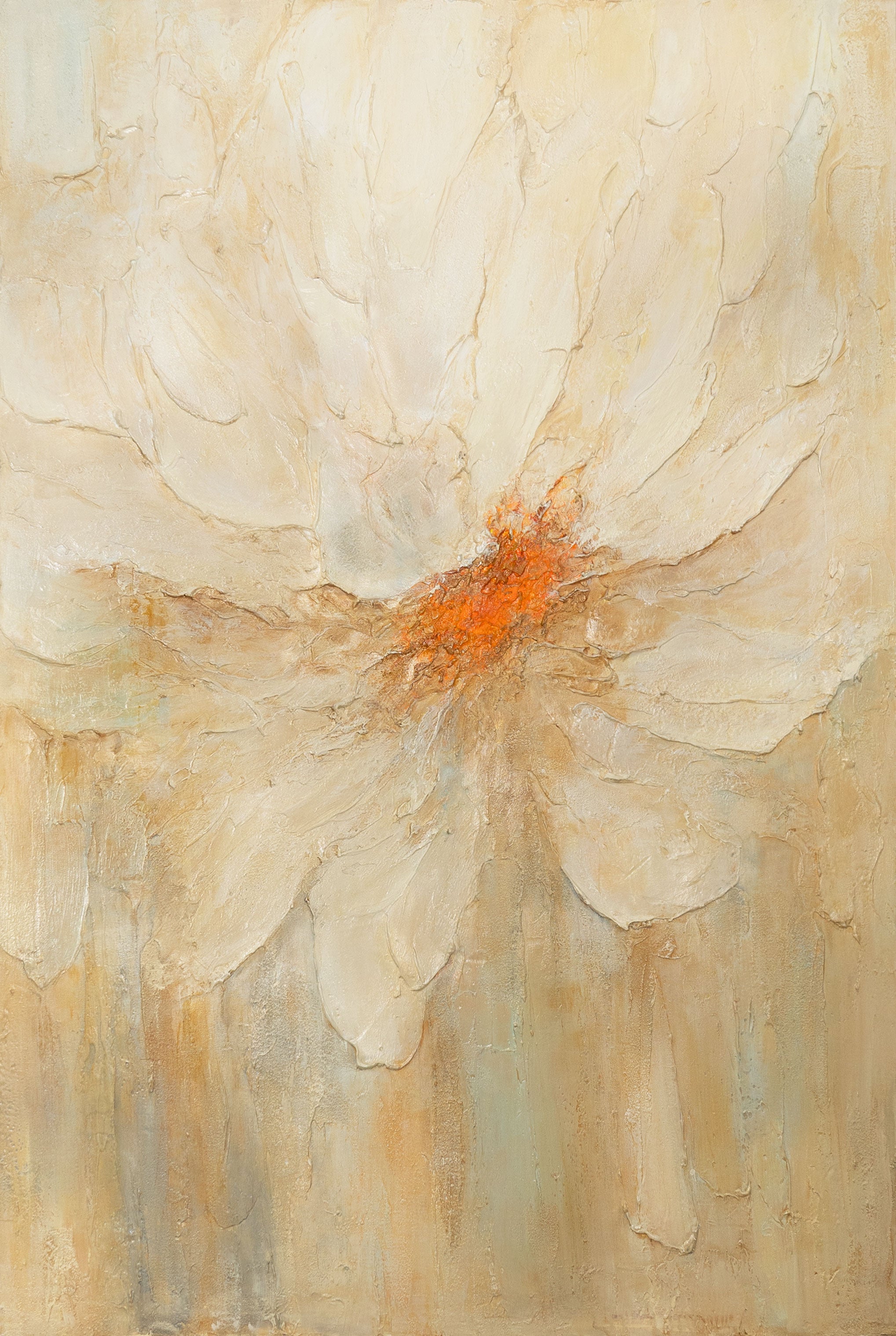 Das Acrylgemälde „Feuerstaub“ erstrahlt in einer faszinierenden Komposition aus sanften Cremetönen und einem leuchtend orangefarbenen Zentrum. Die Struktur verleiht den Blütenblättern Tiefe und Lebendigkeit, während die warmen Nuancen den Eindruck von Licht und Bewegung hervorrufen.