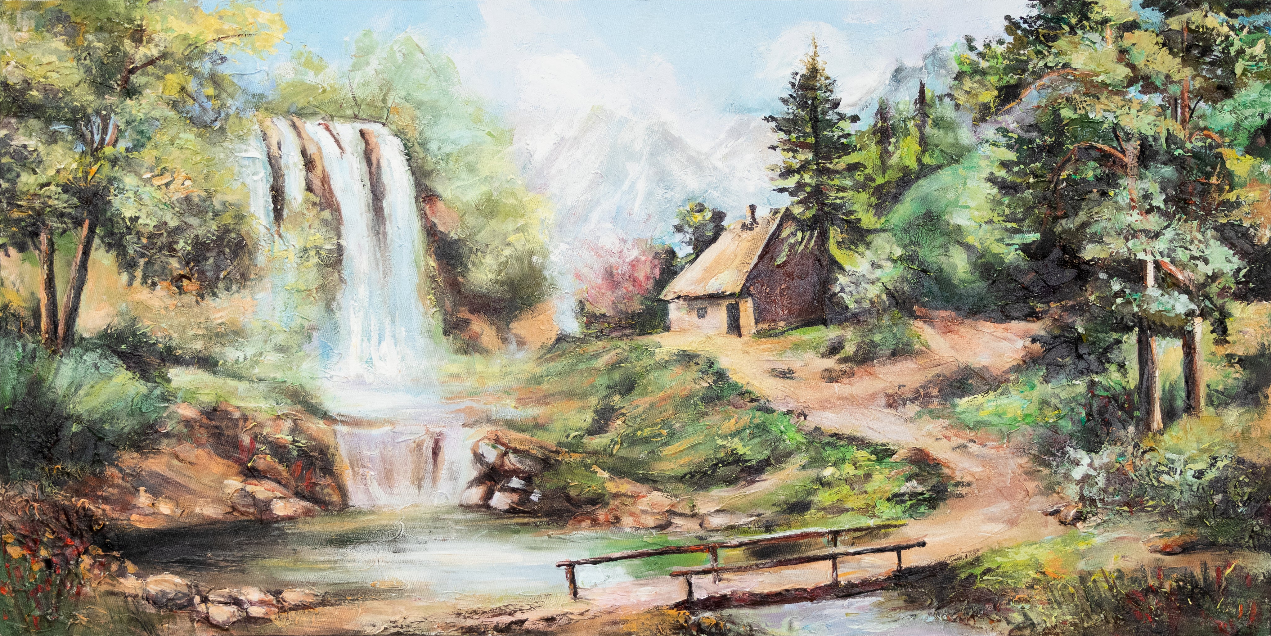 Erleben Sie die friedliche Schönheit der Natur mit diesem handgemalten Landschaftsgemälde. Die detailreiche Darstellung eines Wasserfalls, umgeben von üppigem Grün und einem gemütlichen Landhaus, bringt Ruhe und Gelassenheit in Ihr Zuhause. Jedes Detail dieses Kunstwerks ist 100% handgefertigt, was es zu einem einzigartigen Unikat macht. Genießen Sie die kostenlose Lieferung direkt zu Ihnen nach Hause.