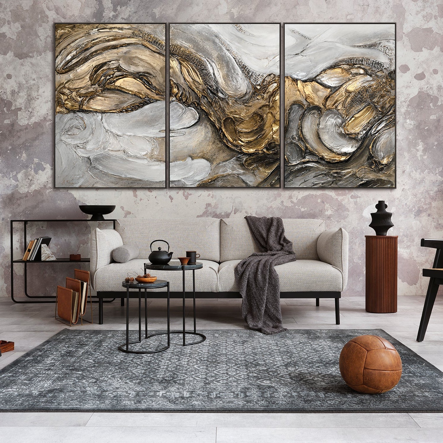 Dieses exklusive, handgemalte Triptychon beeindruckt durch seine dynamische Struktur und die edlen Gold- und Silbertöne. Die dreiteilige Komposition schafft eine ausdrucksstarke Wanddekoration und verleiht Ihrem Wohnraum eine luxuriöse und moderne Atmosphäre. Die aufwendig modellierte Oberfläche verleiht dem Kunstwerk Tiefe und Einzigartigkeit.