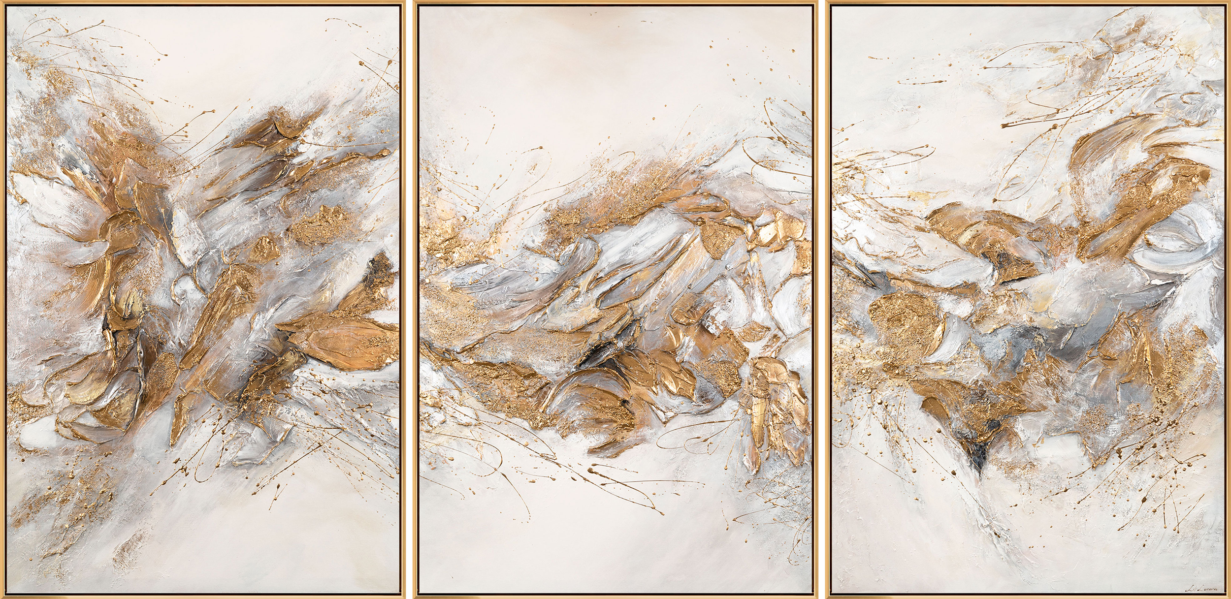 Bereichern Sie Ihr Zuhause oder Büro mit diesem eleganten, abstrakten Triptychon, das durch goldene und weiße Farbtöne eine harmonische Komposition darstellt. Das Bild besticht durch kräftige Farbtöne und ausdrucksstarke Pinselstriche. Es ist 100% handgemalt und wird durch elegante Rahmen hervorgehoben.