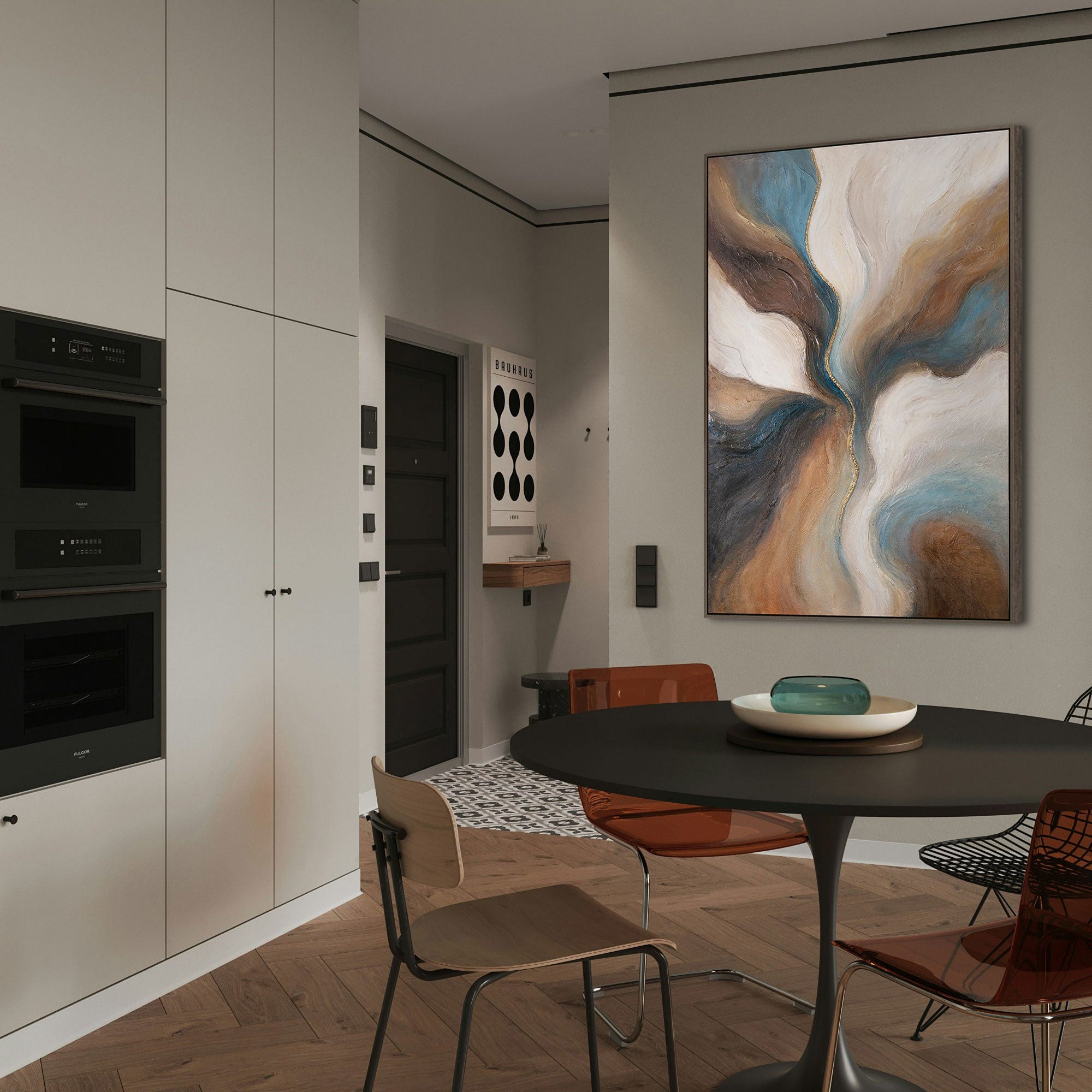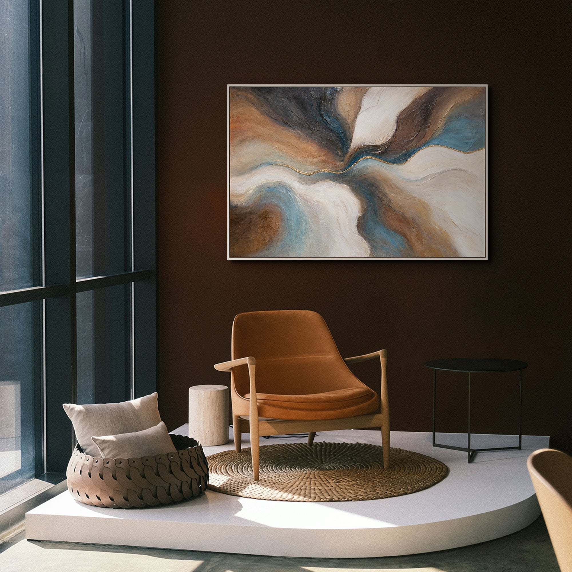 Dieses abstrakte Kunstwerk fügt sich perfekt in moderne, minimalistische und elegante Wohnstile ein. Es verleiht Wohnzimmer, Schlafzimmer oder Büro eine besondere Ausstrahlung und schafft eine Atmosphäre von Ruhe und zugleich kraftvoller Energie.