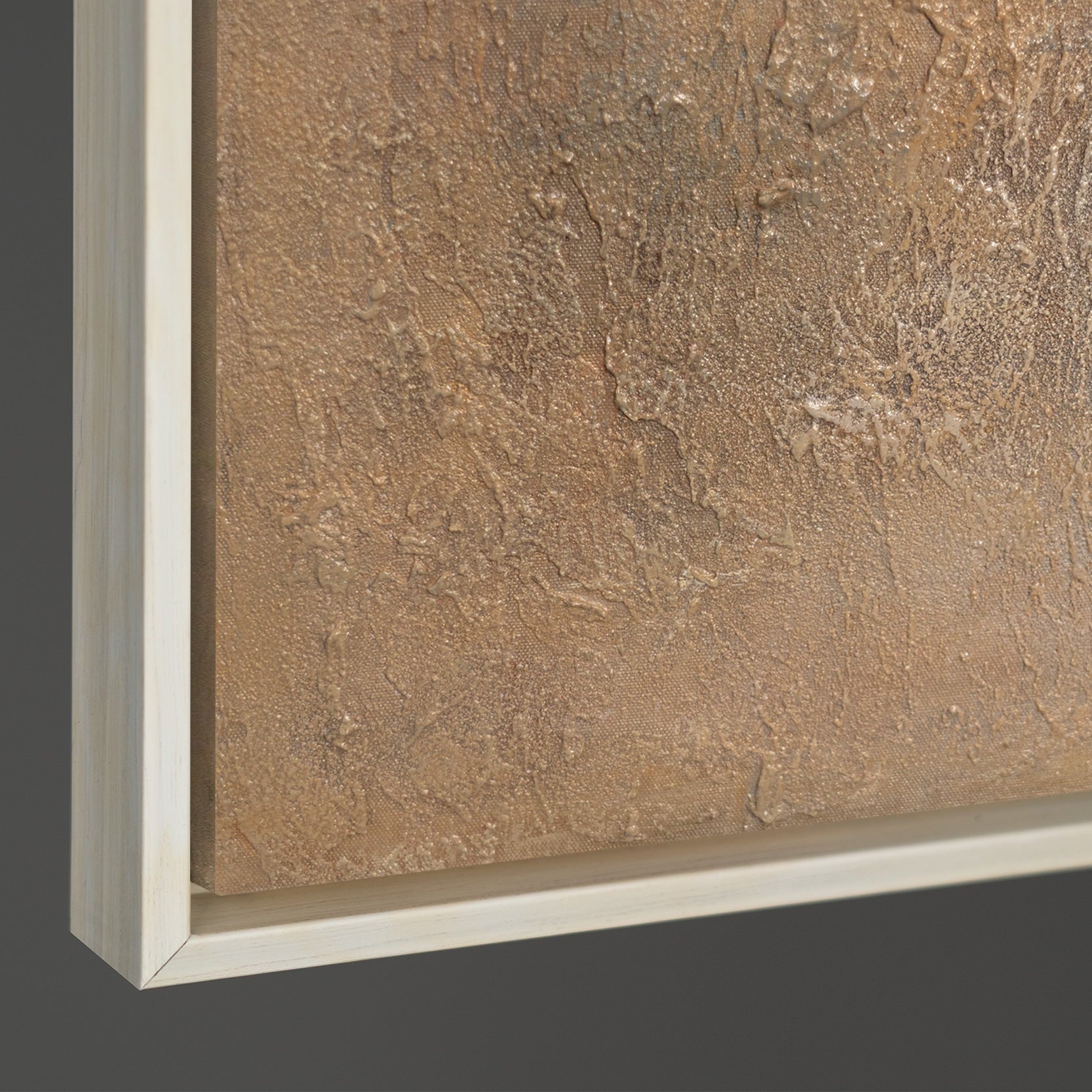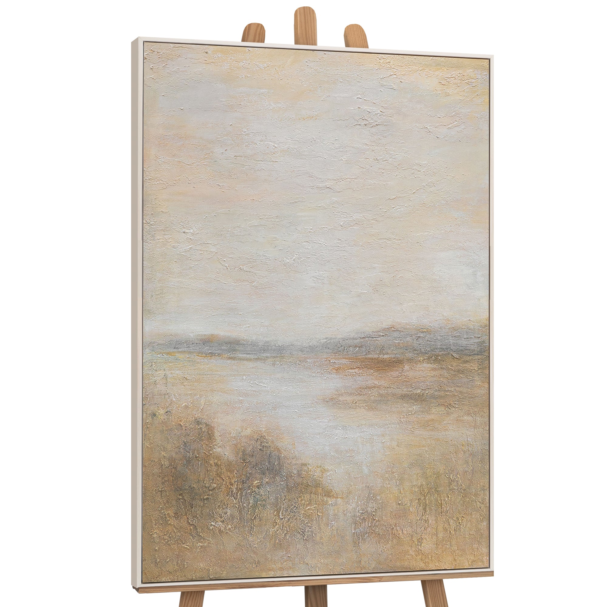 „Nebeliger Morgen“ fängt die stille Poesie eines erwachenden Tages ein. In sanften Beigetönen, feinen Graunuancen und zarten Lichtreflexen entsteht eine atmosphärische Landschaft, die Ruhe und Tiefe zugleich vermittelt. Die strukturierte Oberfläche verleiht dem Werk eine spürbare Haptik, als würde Nebel über eine weite Ebene ziehen.