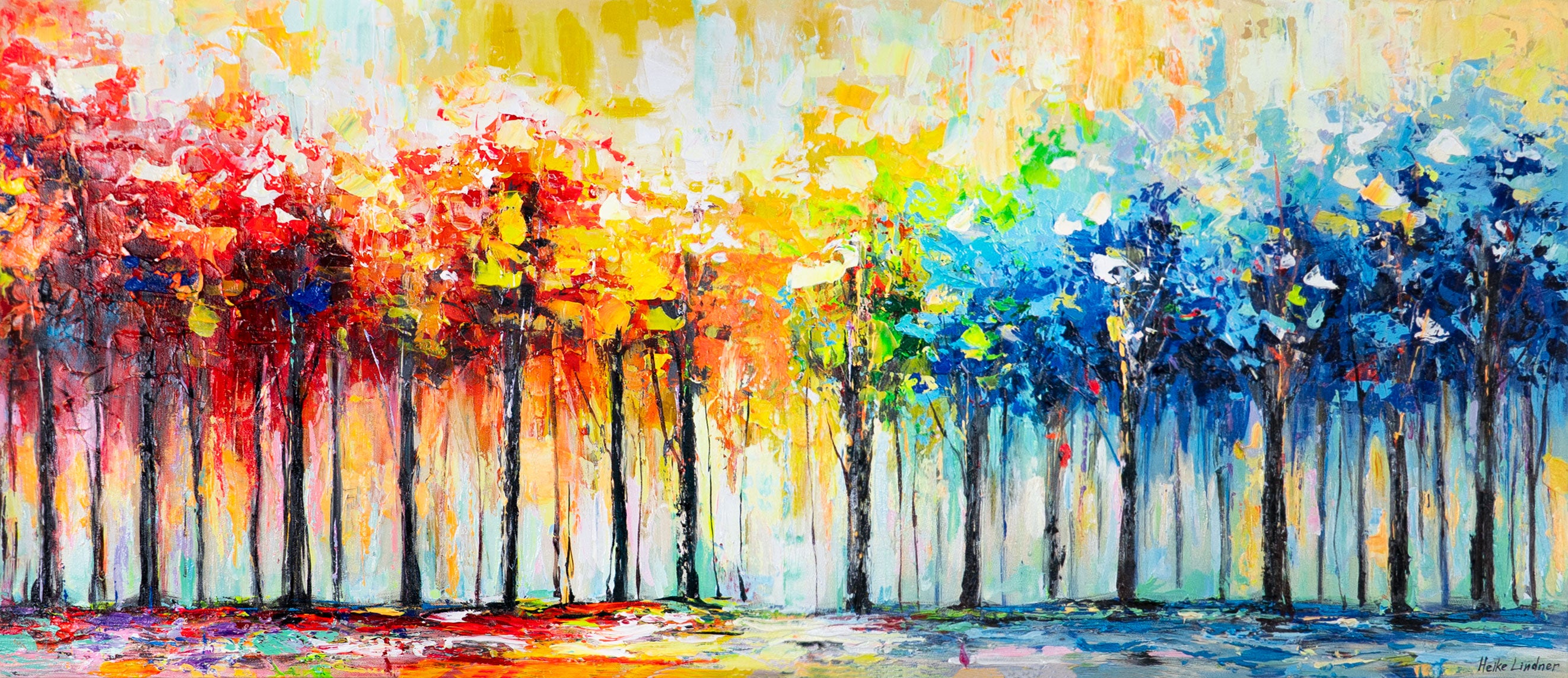 Das Kunstwerk „Farben der Natur“ zeigt eine abstrakte, farbenprächtige Baumreihe in intensiven Blau-, Grün-, Gelb- und Rottönen. Die strukturierte Acryltechnik und der fließende Farbverlauf erzeugen ein harmonisches, lebendiges Gesamtbild.