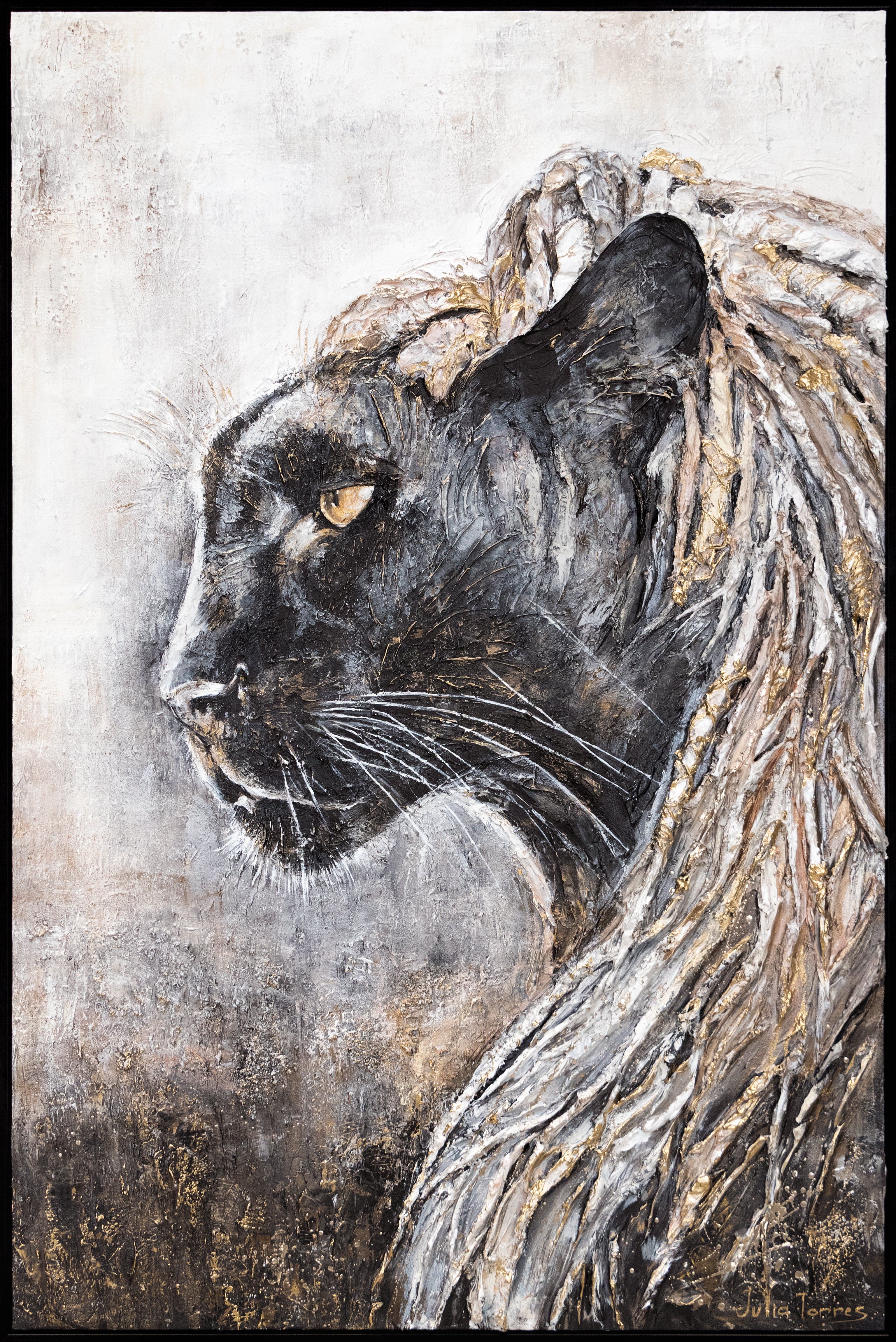 Ein Minimum an Details und Stilbewusstsein. Luxus trifft auf Minimalismus. Textur auf Dynamik. Das Gemälde "Baghira" besticht durch seine Eleganz und moderne Raffinesse.
