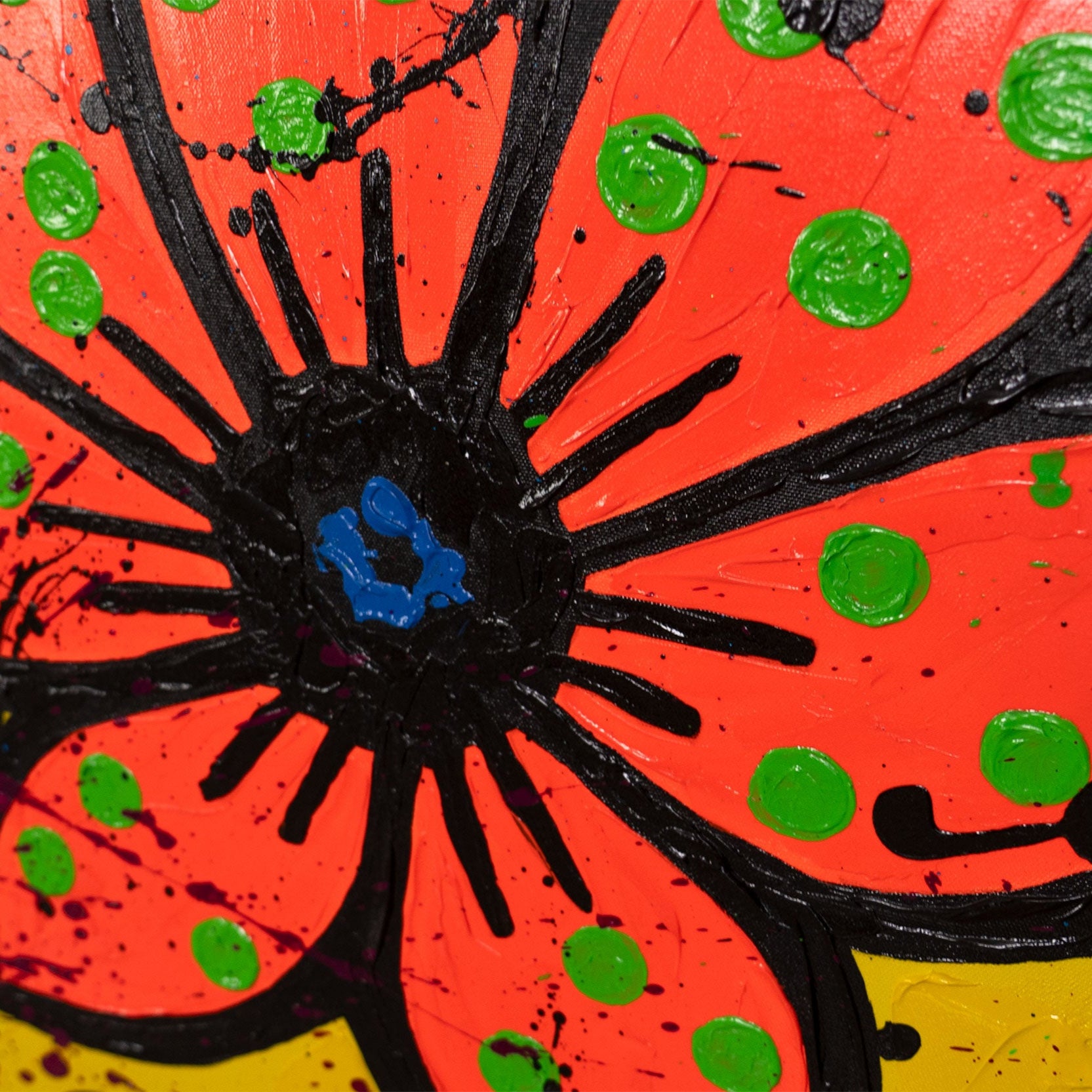 „Blütenrausch“ ist ein farbintensives Pop-Art Blumenbild, das Energie und Lebensfreude ausstrahlt. Der leuchtend gelbe Hintergrund, die roten und blauen Blüten mit grünen Akzenten und die dynamischen Farbspritzer machen dieses Werk zu einem expressiven Statement moderner Kunst. Jedes Detail ist handgemalt und einzigartig.