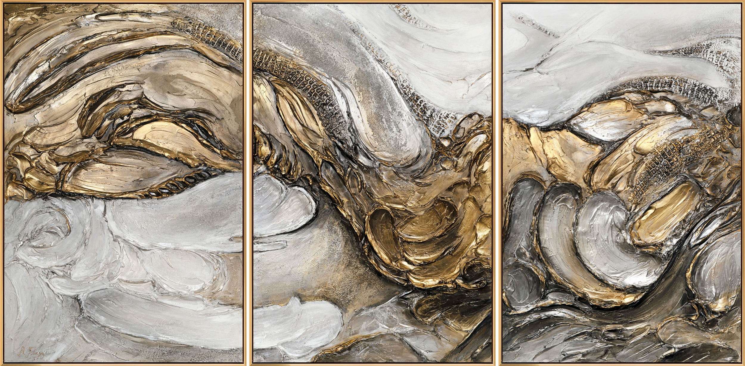 Das Triptychon „Tsunami“ beeindruckt durch seine kraftvolle, abstrakte Komposition mit dynamischen Formen in sanften Weiß-, Grau- und Goldtönen. Dieses handgemalte Leinwandbild in großer Größe (240x120cm und 300x140cm) zeigt eine meisterhafte Kombination von Struktur und Farbspiel, die das Gefühl einer mächtigen Naturgewalt vermittelt. Die strukturierte Oberfläche und die harmonische Farbpalette machen das Triptychon zu einem einzigartigen Kunstwerk für moderne Wohn- und Geschäftsräume.