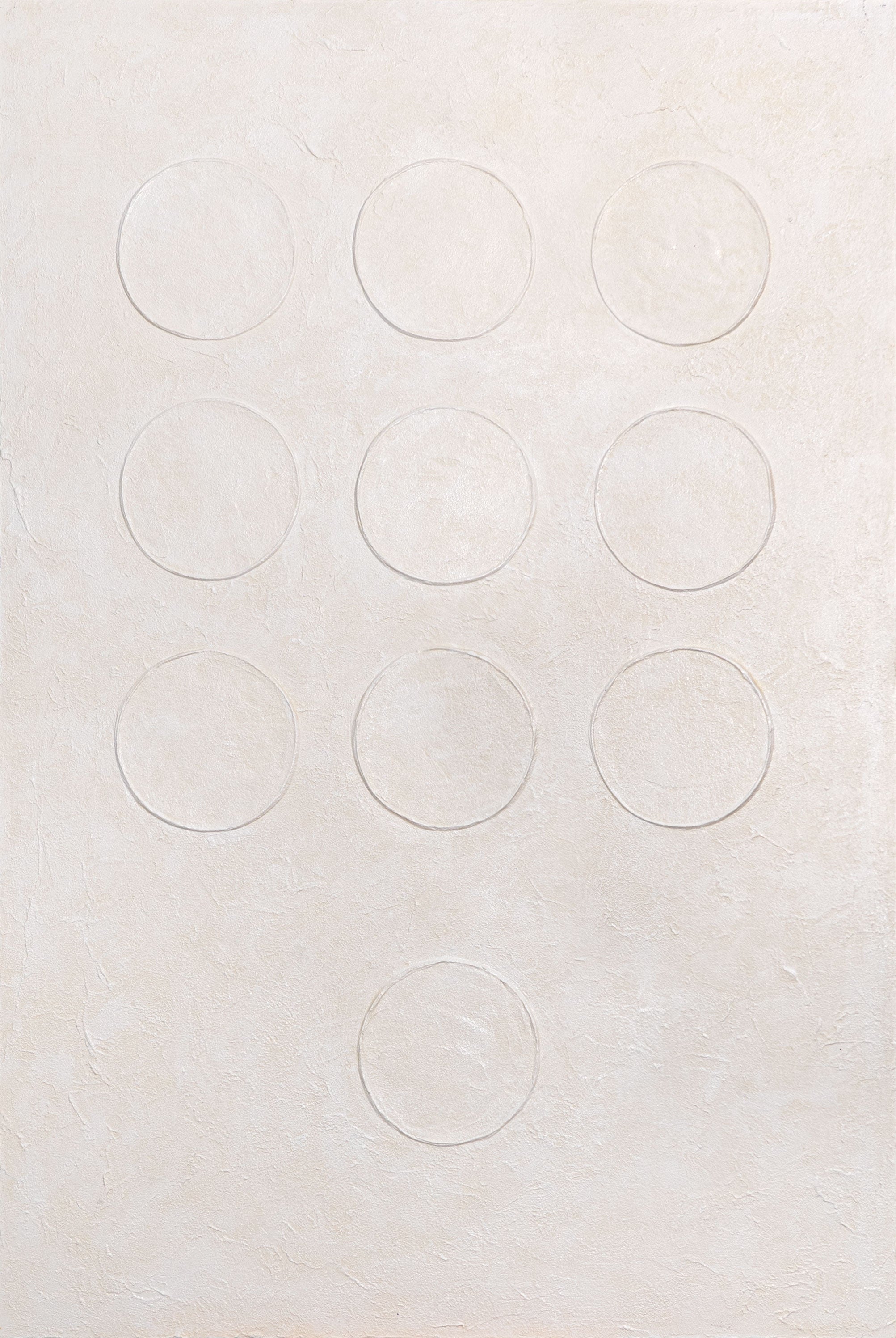 „Weißer Code“ verkörpert die Essenz moderner strukturierter Acrylmalerei. Neun kreisförmige Formen treten subtil aus der Oberfläche hervor und schaffen eine Balance zwischen Ordnung und Bewegung. Die zarten Creme- und Weißtöne verleihen dem Werk eine klare, minimalistische Eleganz, die perfekt zu ruhigen, modernen Räumen passt.